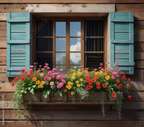 A lush artificial flower border surrounding a distressed wooden backdrop with vintage-style window shutters, rustic decor, floral border