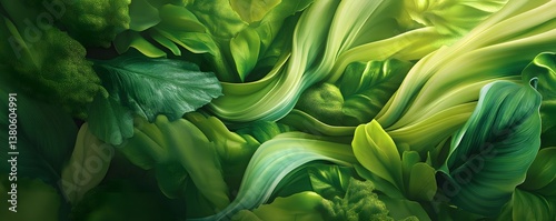 A lush green abstract painting featuring various shades and textures of leaves and flowing shapes