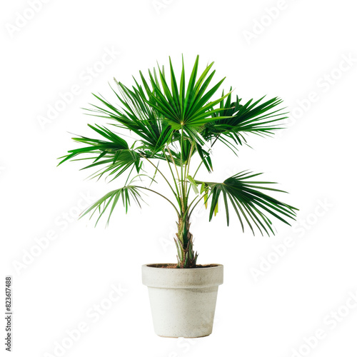 A lush green palm plant stands tall in a white pot, isolated on a transparent background