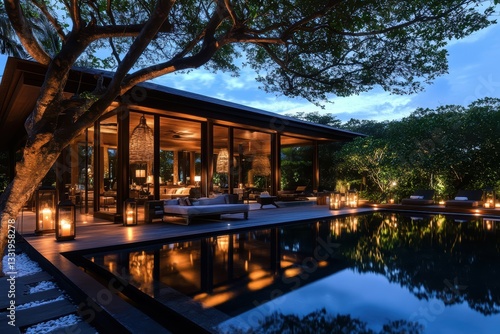 A luxurious beachfront bungalow in the Maldives (or Bali) at sunset, illuminated by warm ambient lighting