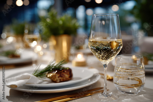 A luxurious dinner table featuring fine wine, intricate glassware, and beautifully arranged dishes, perfect for a celebration or intimate gathering with friends or family.