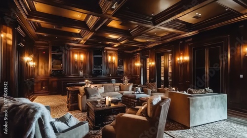 A luxurious living room with dark wood paneling, a plush sofa, armchairs, and a coffee table.