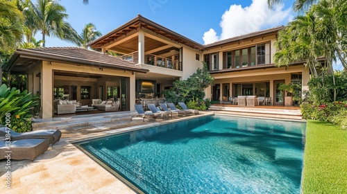 A luxury house with an infinity pool, surrounded by a tropical garden with palm trees and lush greenery.