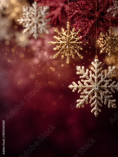 A luxury red and gold Christmas background with glowing bokeh lights and soft snowflake details. Perfect for holiday designs, banners, and festive celebrations.