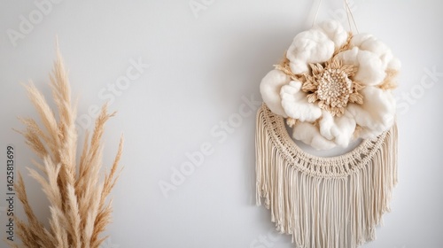 A macrame wreath with a large cotton flower hangs on a white wall. Made from natural cotton rope, it's an eco-friendly decoration. A unique gift idea!
