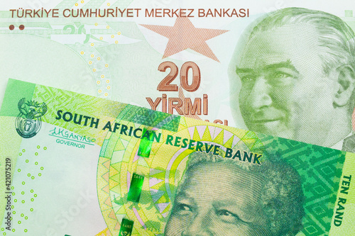 A macro image of a shiny, green 10 rand bill from South Africa paired up with a green, twenty Turkish lira bank note. Shot close up in macro.