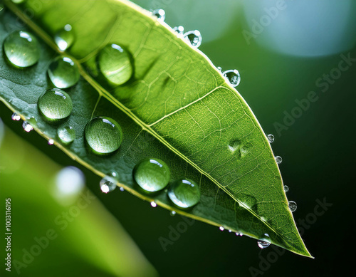 A macro shot of water droplets on a green leaf, with the surface reflecting light.