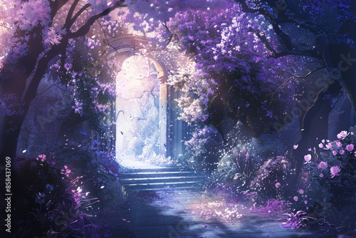A magical garden filled with blooming flowers and trees, leading to an ethereal gate that shines in the distance