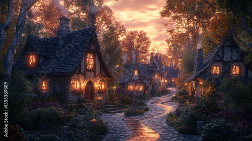 A magical village comes alive with the warm glow of sunset, inviting dreams of fairy tales.