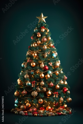 A magnificently decorated Christmas tree against a serene green backdrop