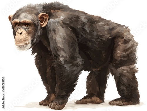 A majestic adult chimpanzee stands majestically against a stark white background showcasing its powerful physique and ligent gaze.