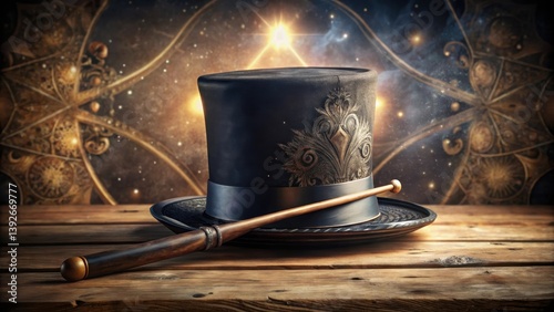 A majestic black top hat sits atop a elegant wooden wand, adorned with intricate carvings and mystical symbols, radiating an aura of mysticism and ancient magic , mystic, wizard