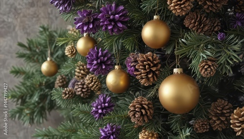 A majestic Christmas tree adorned with purple and gold ornaments and natural pine cones , luxury, glamorous