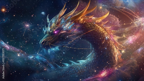 A majestic dragon swirling through a cosmic galaxy filled with vibrant colors and stars