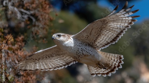 A majestic hawk soaring through a clear blue sky, showcasing its impressive wingspan and sharp features.
