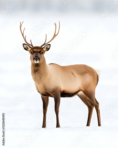A majestic light brown deer with large antlers stands proudly in a snowy landscape
