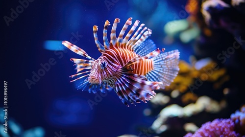 A majestic lionfish swimming through the vibrant coral reef. Blue water background with copy space.