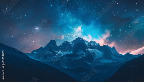 A majestic mountain range silhouetted against a vibrant night sky filled with stars and a swirling galaxy.