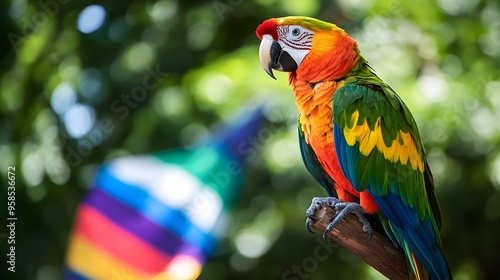A majestic parrot with rainbow feathers, perched on a branch with an LGBTQ pride flag in the background