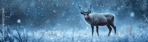 A majestic reindeer stands gracefully in a snowy landscape, surrounded by softly falling snowflakes, embodying winter's tranquil beauty.