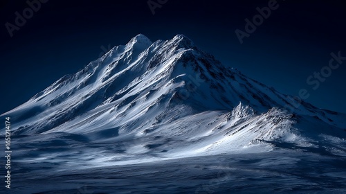 A majestic snow-capped mountain peak with jagged peaks and snow-covered slopes, illuminated by the moonlight, set against a dark blue sky.