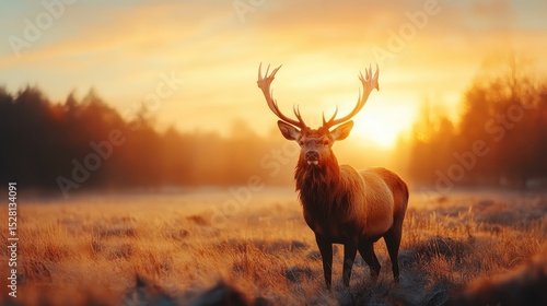 A majestic stag stands confidently in a misty meadow at sunrise, embodying strength, grace, and the beauty of nature in a serene and captivating moment.