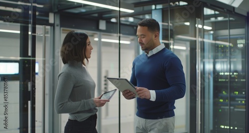 A male and female IT professional discussing in front of a high speed super computer server room with glass walls, with a tech company office interior background.