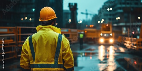 A male construction worker in a yellow raincoat observes a construction site at dusk.