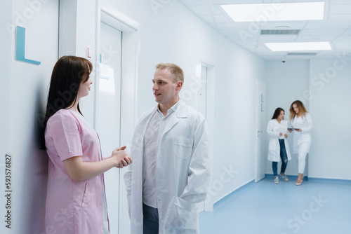 A male doctor communicates with a nurse in the corridor of the hospital. In the background are colleagues doctors.