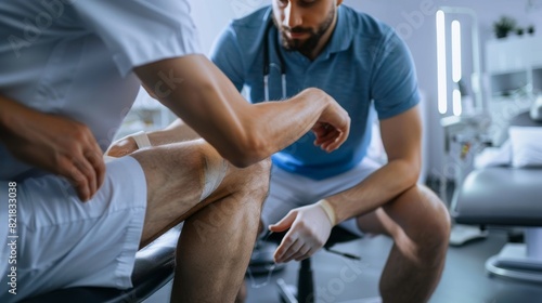 A male physical therapist treats a man's knee in a rehabilitation clinic. The concept of physiotherapy and osteopathic medicine in action.