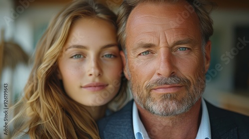 A man and a woman posing closely together with warm smiles in a bright, natural setting