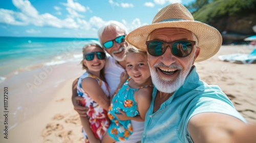 A man and two children are posing for a picture on a beach