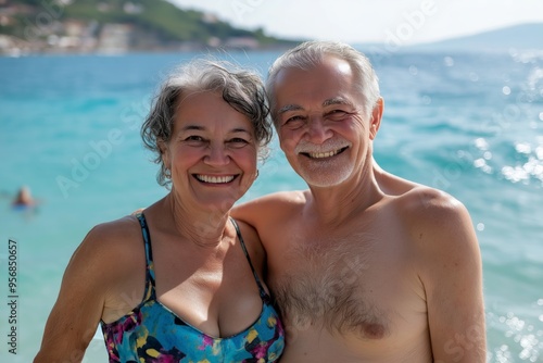 A man and woman are smiling at the camera on a beach. The man is wearing a shirtless shirt and the woman is wearing a bikini. Scene is happy and relaxed