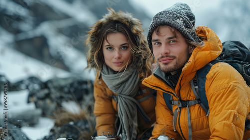 a man and woman dressed in winter-spring outdoor clothes on hiking trip eating food they cooked in mountain environment,