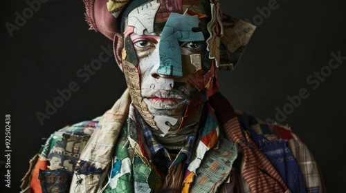 A man blends textiles and vibrant colors on his face and attire, showcasing intricate designs and textures in a striking artistic expression