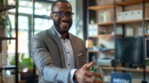 A man dressed in a grey suit, wearing glasses, and extending a handshake in a modern office setting, representing professionalism and friendliness.