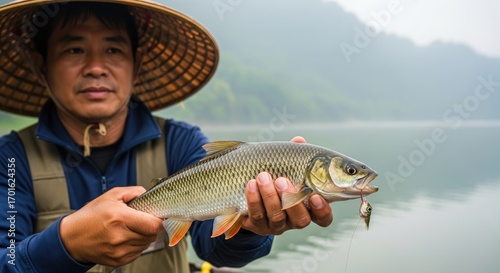 A man holding a fish in a serene lake setting.