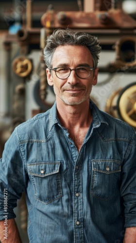 A man in a blue shirt and glasses standing next to some machinery. AI.