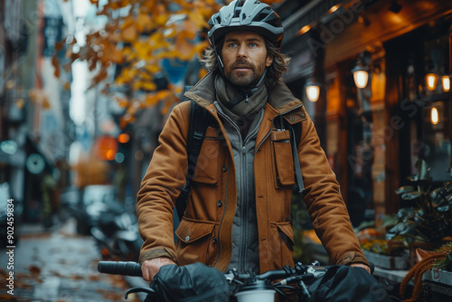A man in a brown jacket and helmet is riding a bike down a street. The man is wearing a scarf and has a backpack on.