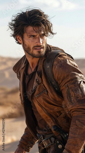 A man in a brown leather jacket and black pants is standing in a desert
