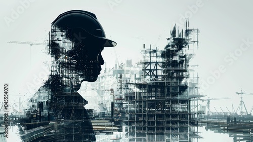 A man in a hard hat stands in front of a large building. The image is a silhouette of a person wearing a hard hat, with the building in the background. Scene is serious and focused