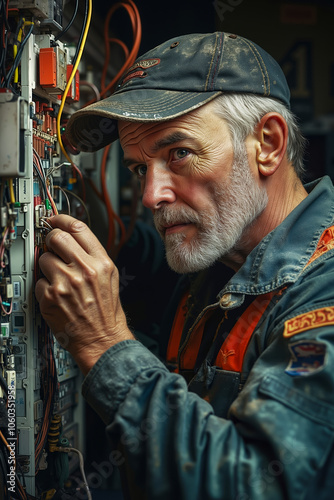 A man in a hat is working on an electrical panel