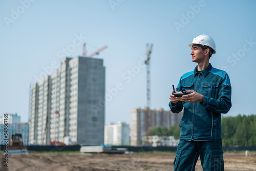A man in a helmet and overalls controls a drone at a construction site. The builder carries out technical oversight.