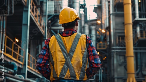 a man in a safety vest and hard hat standing in front of a factory building with pipes