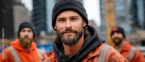 a man in an orange safety vest, standing outdoors in what appears to be cold weather due to his beard and the winter attire he's wearing