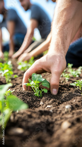 A man is planting a seedling in the dirt. The other people in the background are also planting seeds
