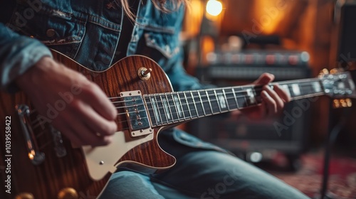A man is playing a guitar in a room with a blue jacket on