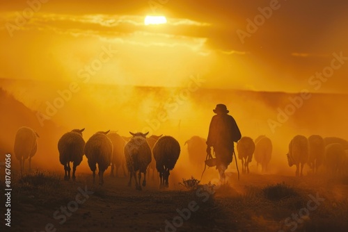 A man is seen herding a flock of sheep at sunset. Suitable for agriculture or nature themes