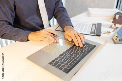 A man is sitting at a desk with a laptop and a notebook. He is writing in the notebook and has a pen in his hand. There are three houses on the desk, and a calculator is also present