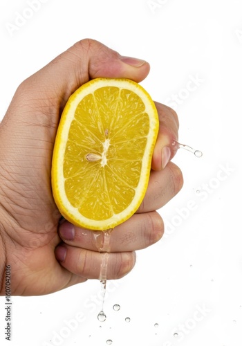 A man is squeezing a fresh lemon half, extracting juice and spraying droplets. Healthy citrus fruit concept for drink and ingredient.